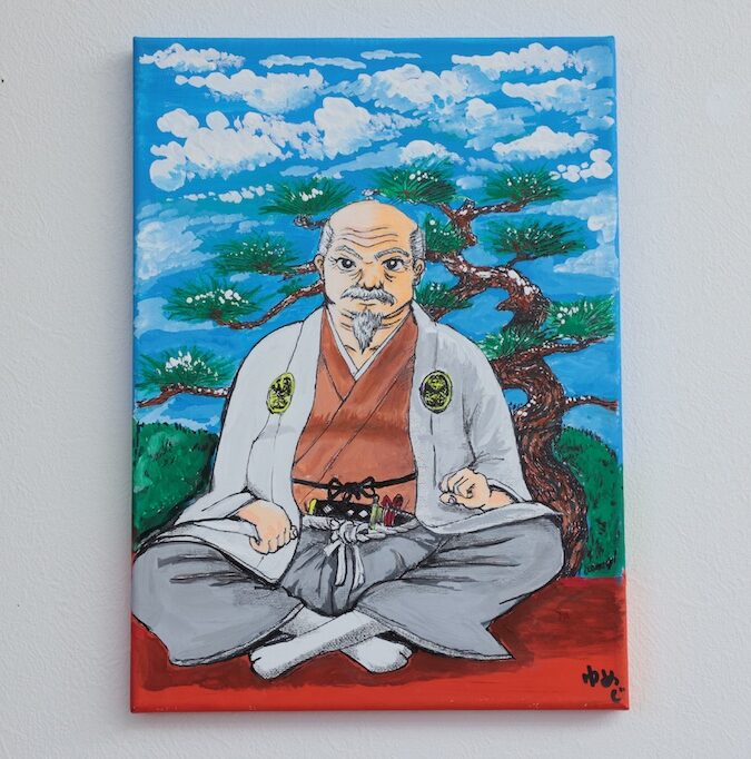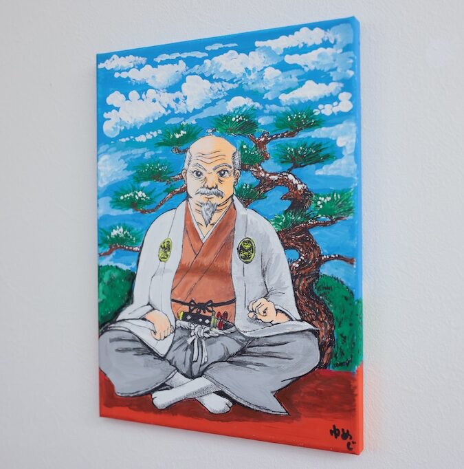 僕は歴史が好きで、特に好きなのが徳川家康です。戦国の世を生きた家康のかっこよさを表現したいと思い 冬の空背景には松、松の前に堂々と座ってる姿を描きました。