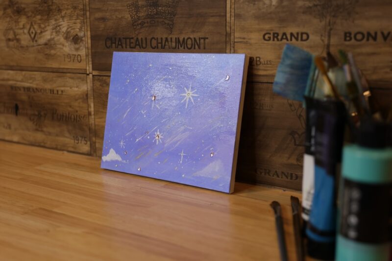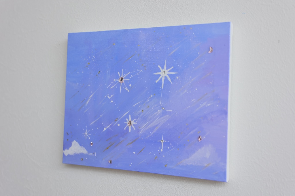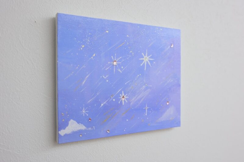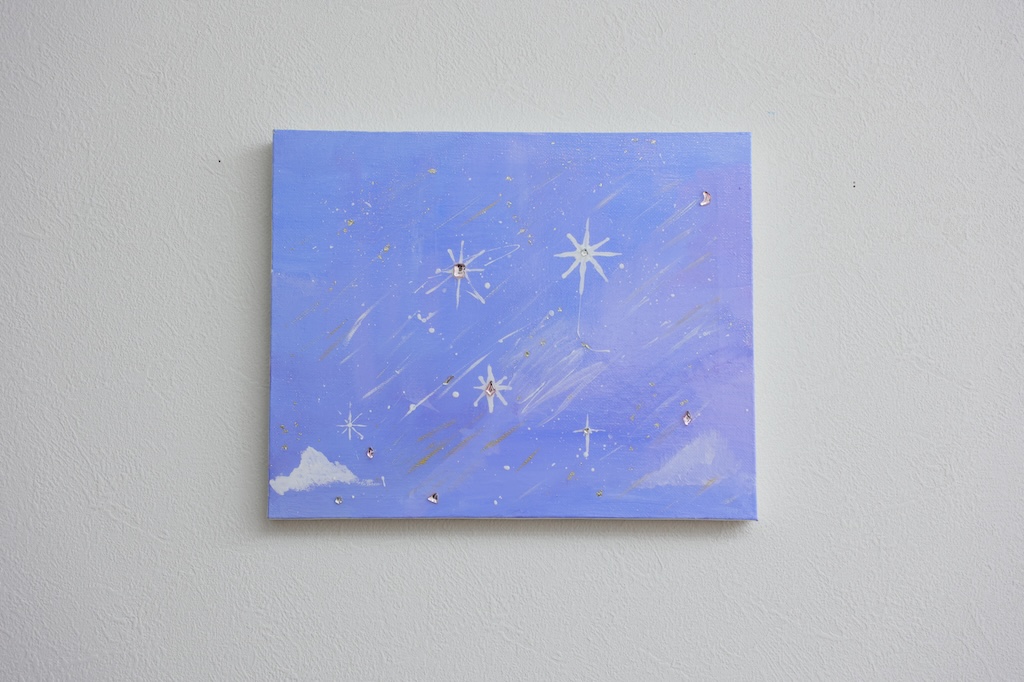 ブルーをベースに白で雲を描いて星が降っているみたいに細い線を描きました。