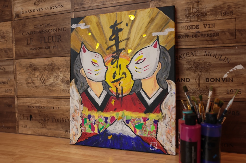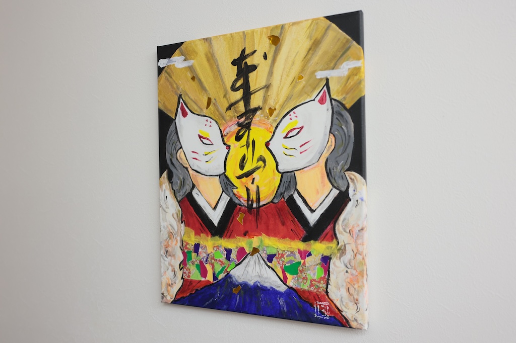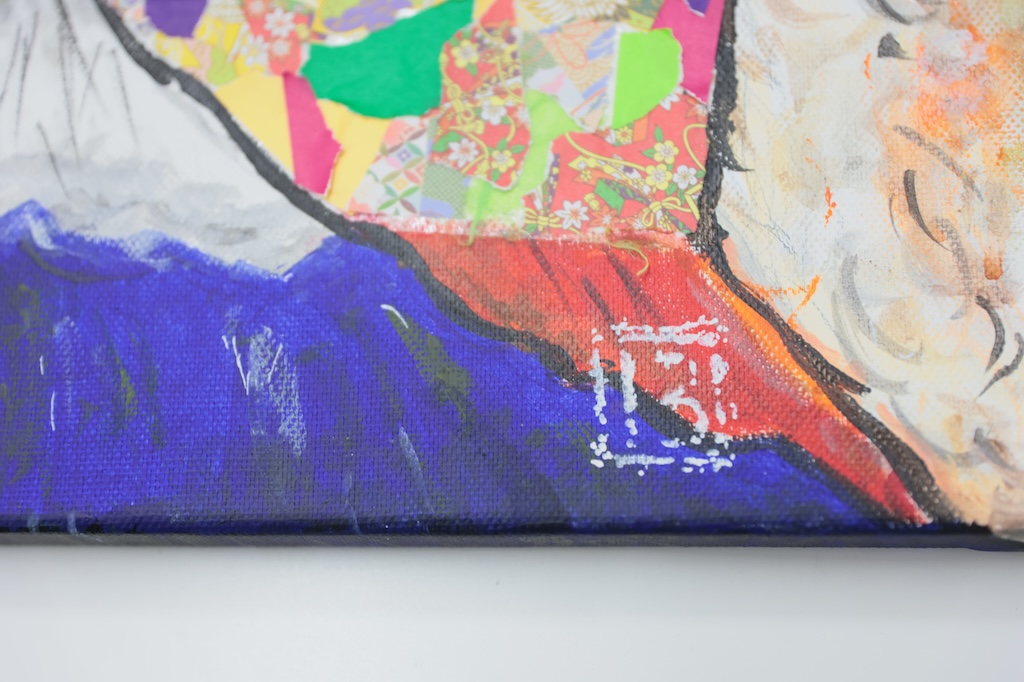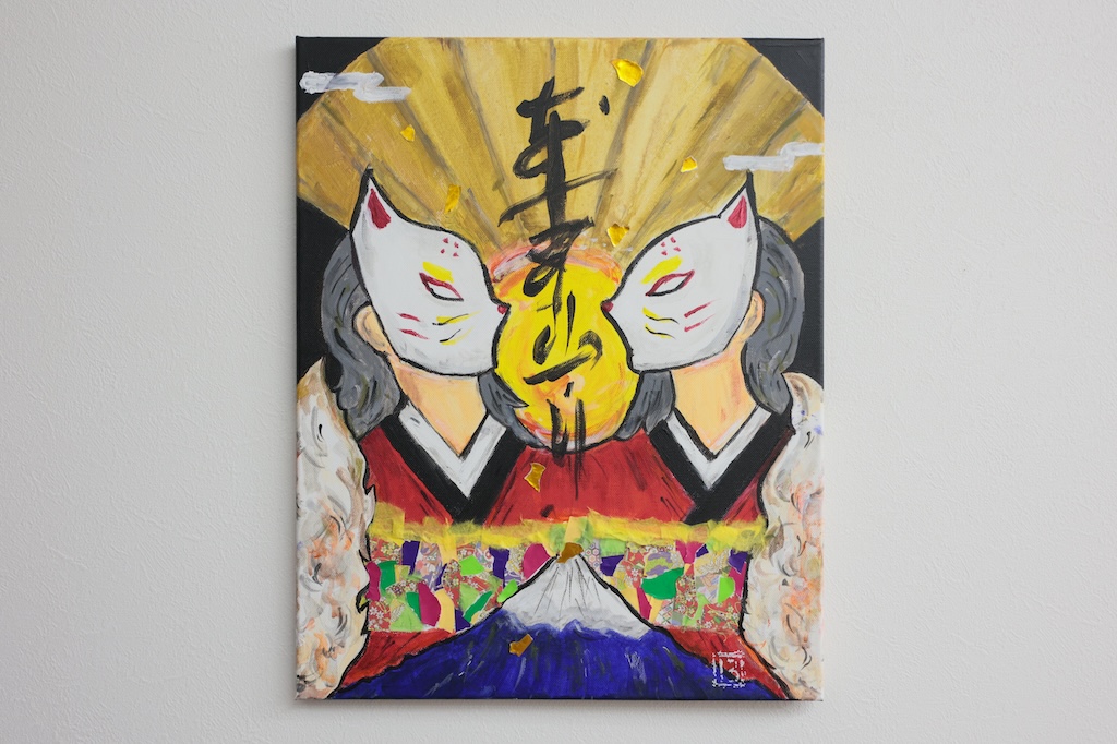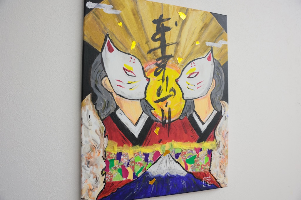 千代紙を千切って貼りつけ、センターには大胆に筆文字を。