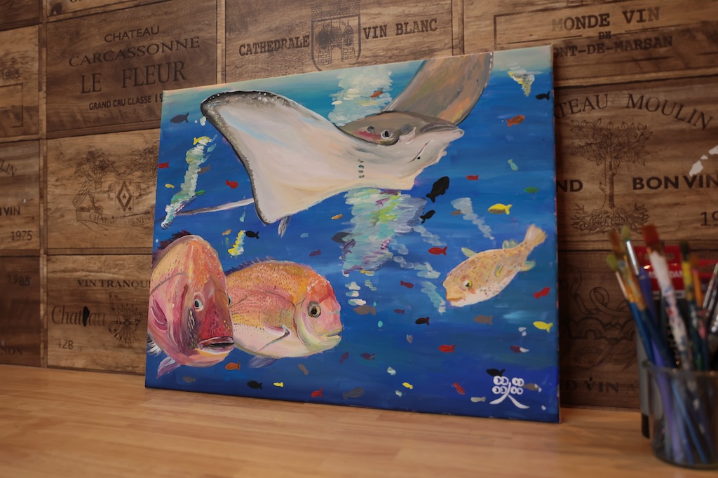 エイの色の濃淡や、単調にならないように動きをつけることに気をつけました。